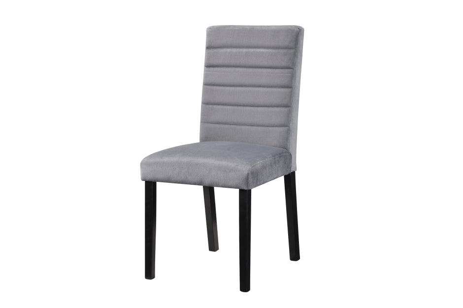 The design of the Andreas Collection is scaled to seat four, making this modern dinette group the perfect addition to your casual dining space. A black finish is utilized over ash veneer highlighting its distinct veneer. Grey upholstered chairs are paired with the table, each featuring horizontal contouring and modern lines
