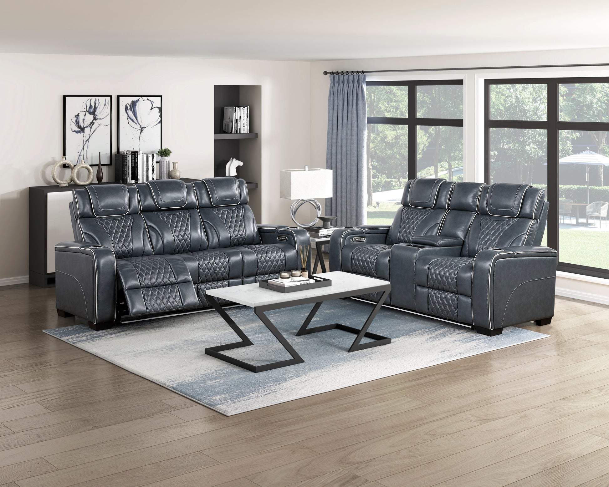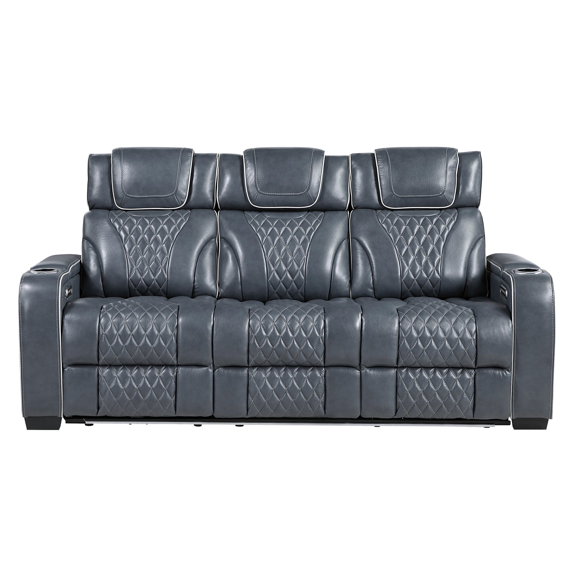This luxurious Power Double Reclining Sofa redefines comfort and entertainment for your living space, offering an unparalleled cinematic experience right at home. Upholstered in premium top-grain leather where it matters most, this sofa combines opulent comfort with cutting-edge technology. Both seats feature one-touch power recline and power-adjustable headrests, allowing you to find your perfect position effortlessly. Beyond its incredible seating, this sofa is packed with features like a convenient drop-down center table with integrated cup holders, reading lights, and wireless charging. Enjoy the added indulgence of heat and air massage functions with three intensity levels and six massage points per seat, along with practical amenities such as storage armrests with USB-A and USB-C charging ports, and ambient blue LED lighting, making it the ultimate hub for relaxation and entertainment.