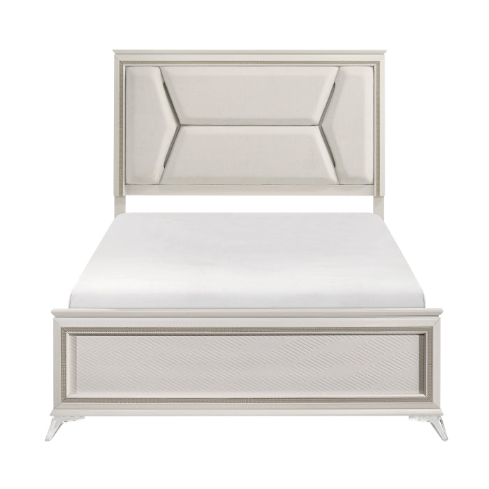 Transform your bedroom into a luxurious retreat with this stunning white and gold panel bed. Crafted with a durable engineered wood frame, complemented by unique acrylic front legs and sturdy metal rear legs, this queen bed offers a perfect blend of style and stability. The chenille upholstered headboard, featuring built-in LED lighting, adds a touch of modern glamour while providing a comfortable backrest. The diagonal grain embossed panels on the headboard and footboard create a sophisticated texture, enhancing the overall visual appeal. This bed includes a headboard, footboard, and rails, providing a complete framework for your sleeping sanctuary. A foundation or box spring is required, ensuring optimal mattress support. Assembly is required