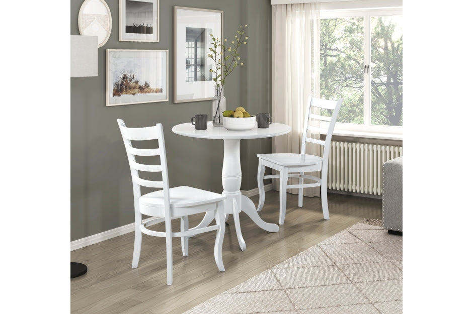 The Bonnie Collection presents a traditional profile that will be at home anywhere from a casual country farmhouse to a suburban breakfast nook. The white finish that covers the collection creates the perfect canvas for your favorite tabletop accessories. Traditional and transitional accenting subtly lends their timeless profiles to the look of the collection, with the contoured ladder backs of the wood chairs complementing the pedestal base and round tabletop