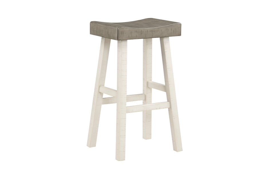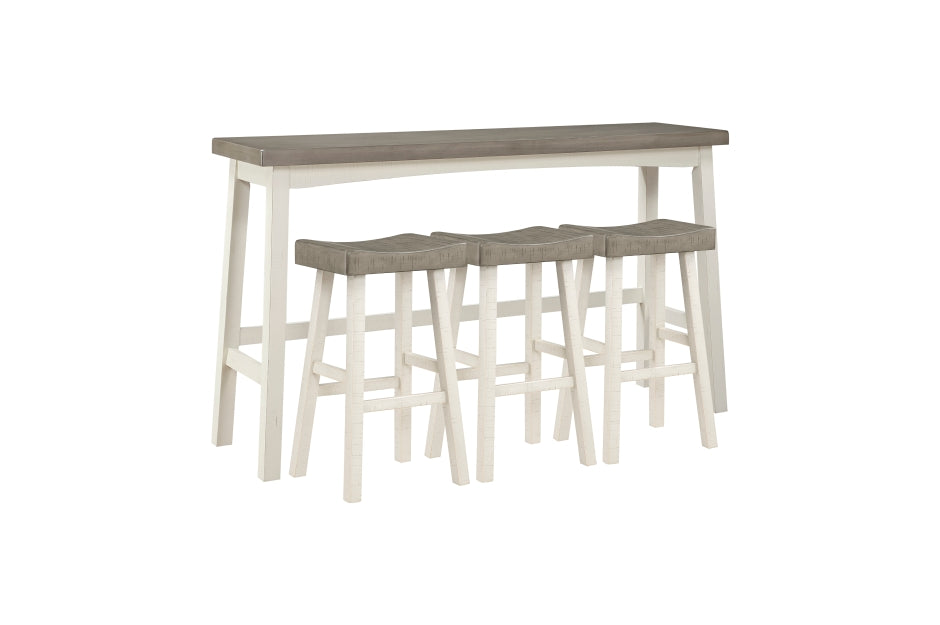 Stylistically versatile for placement in your home’s casual dining space, the transitional design of the included three 29-inch contour-seat barstools and 42-inch bar-height table is complemented with rusticated accent, subtle profile, and three optional neutral finishes - two-tone black and brown, two-tone white and coffee, or black rub-through - to make the Caspian Collection a perfect choice for your dining needs