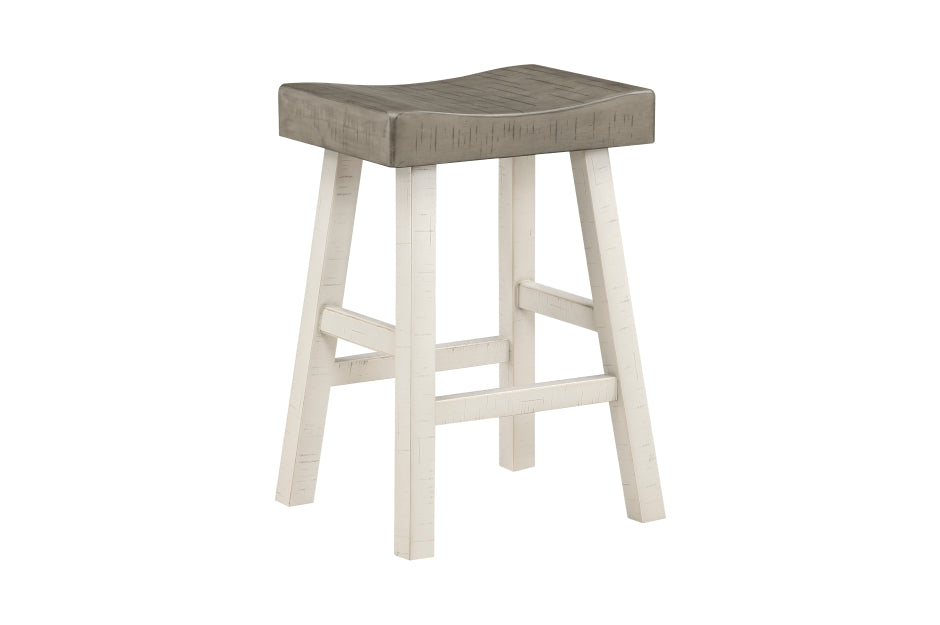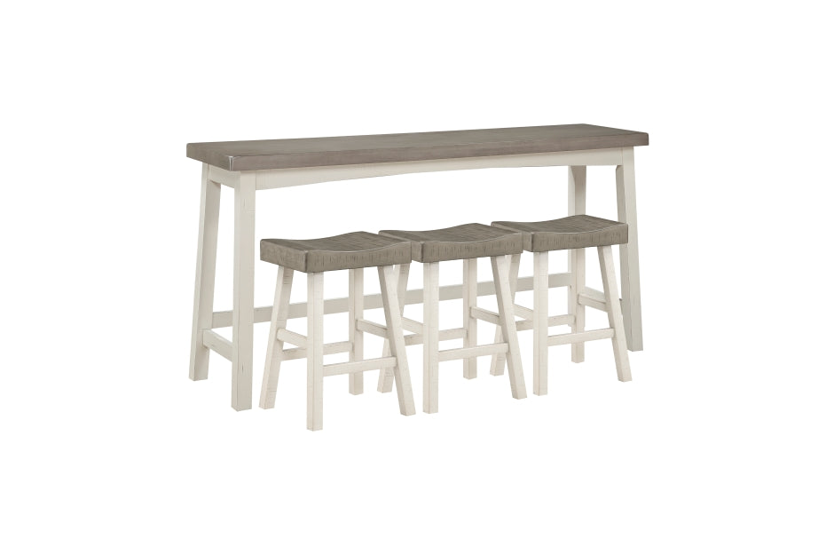 Stylistically versatile for placement in your home’s casual dining space, the transitional design of the included three 24-inch contour-seat barstools and 36-inch counter-height table is complemented with rusticated accent, subtle profile, and three optional neutral finishes - two-tone black and brown, two-tone white and coffee, or black rub-through - to make the Caspian Collection a perfect choice for your dining needs