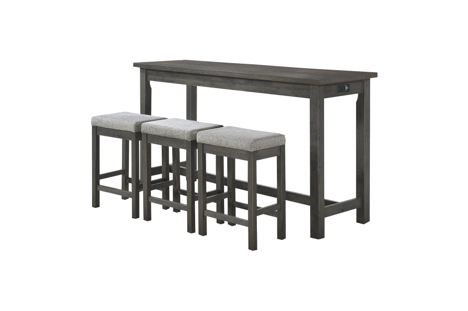 The elevated dining experience that the Connected Collection provides will fuel your device’s battery life while you fuel yourself. The convenience of built-in USB ports and A/C power turns your casual dining area into an efficient recharging station. The four-piece pack of the Connected Collection includes a counter height table and three barstools. A single drawer allows for discrete storage on the table’s side apron. As a neutral pallet for your decorative preference, the collection features a gray finish over ash veneer, with the neutral gray tone of the barstool’s seats providing subtle accent