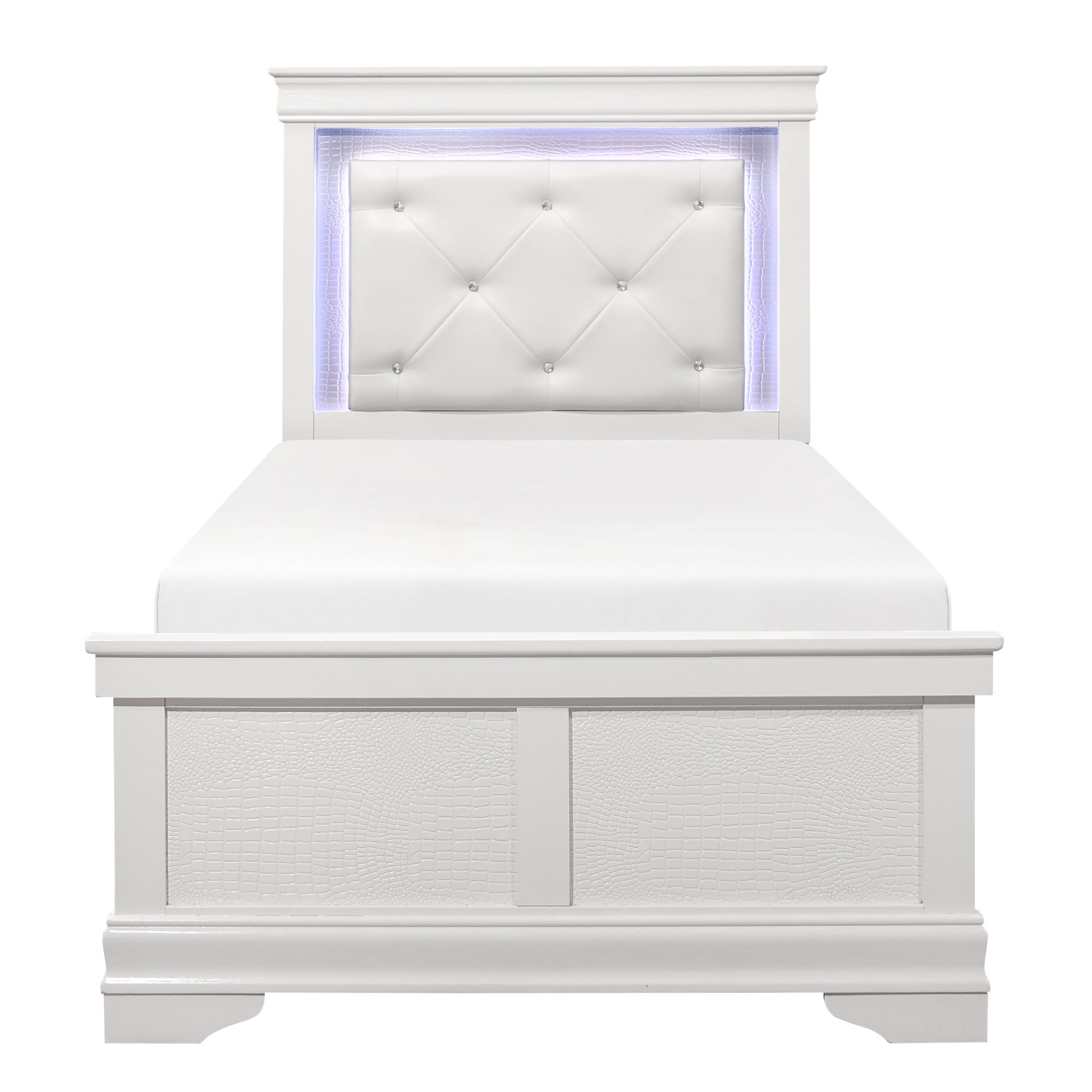 The unexpected intersection of traditional design and glamorous styling creates the dynamic look of the Lana Collection. A white finish is utilized to enhance the faux alligator embossed fronts of the Twin bed. The headboard features a faux leather crystal-tufted headboard as well as dramatic LED backlighting