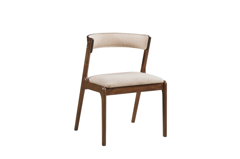 Mid-Century Modern inspires the design of the Leawood Collection dining offering. The rectangular table easily expands by way of the self-storing leaf. Beige textured fabric upholstery covers the seats and backs of the contoured wood-framed side chairs. The collection features walnut veneer with walnut finish, solidifying the classic presentation