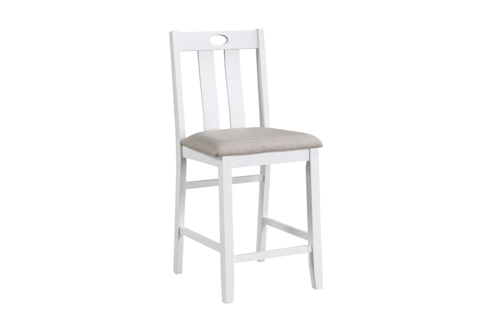 The two-tone finish of the Lowell Collection pairs a bright white finish and weathered gray, over oak veneer, creating a striking combination perfect for your home’s casual dining space. The counter-height dining group is conveniently packaged to include a table and four coordinating chairs. The seats of the chairs are covered in light gray fabric for complementing contrast to the collection’s finish