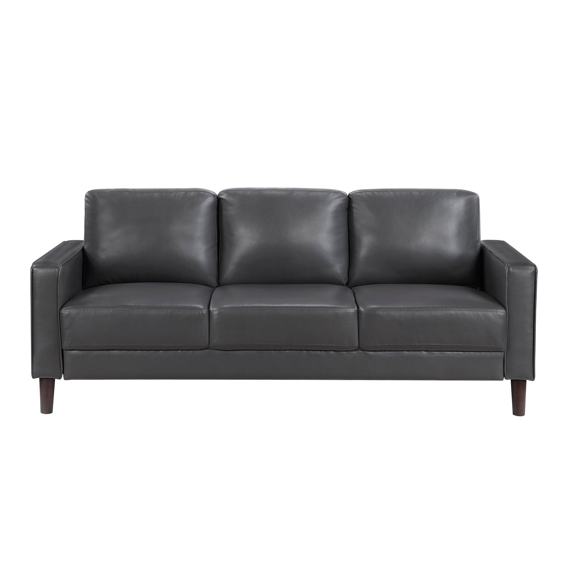 The elements that define modern style create a timeless look for your home with the addition of the Malcolm Collection. Track-style arms and defining welt lend a tailored aesthetic to the clean lines of the sofa making the piece well-suited for modern, transitional, rustic, or industrial inspired spaces. The collection is covered in dark gray faux leather upholstery further lending to the decorative versatility of this modern-classic offering.