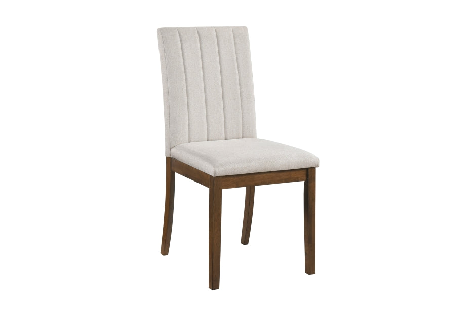 The Maude Collection’s transitional style is scaled for your home’s casual dining space. The collection’s birch veneer features a chestnut finish, the classic hue highlighting the distinct wood grain. Coordinating wood-framed side chairs flank the table, their seats and channel-stitched backs covered in beige textured fabric upholstery