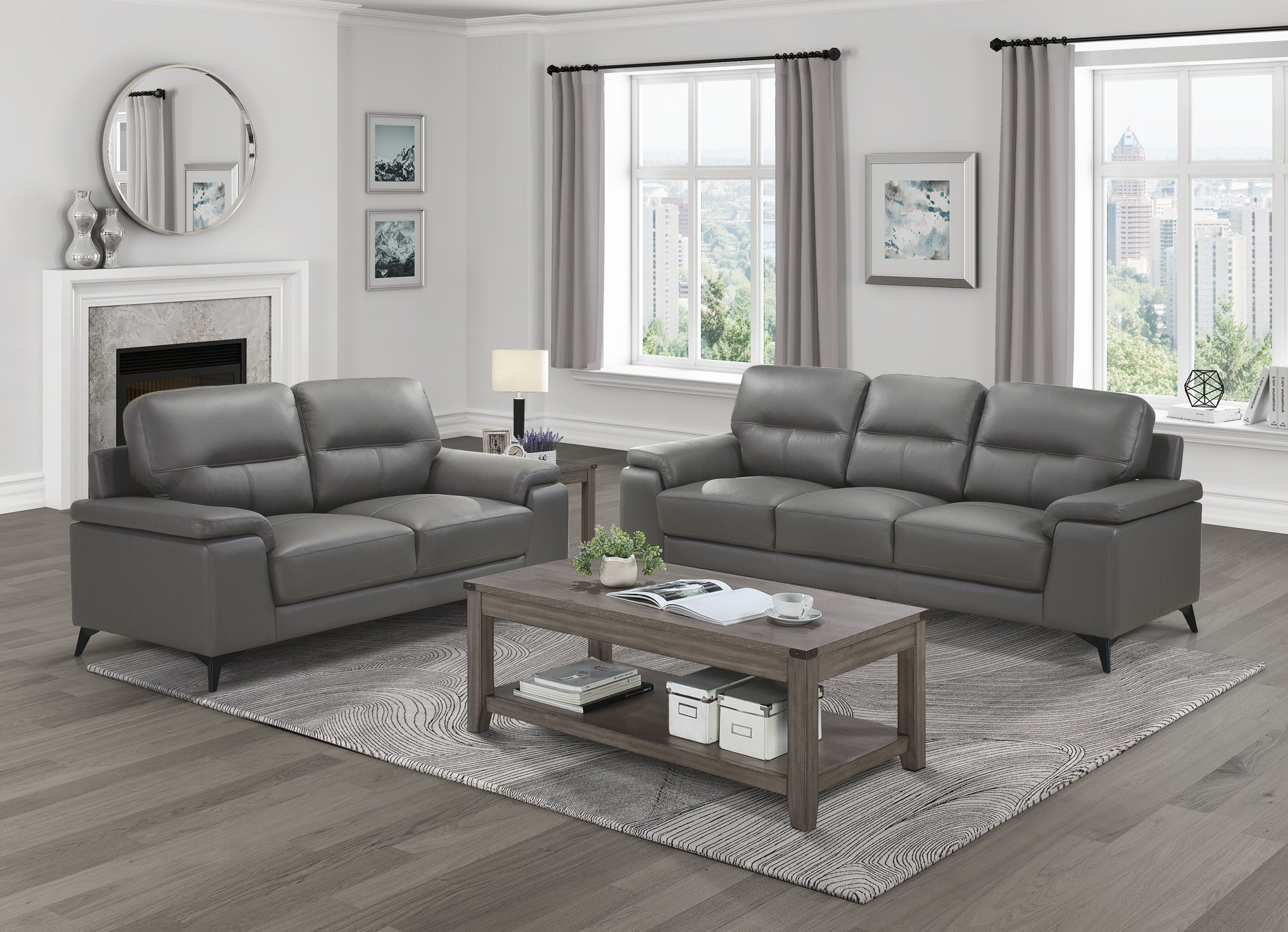 Styled for the modern home, the Mischa Collection’s sofa blends the luxurious feel of leather with the comfort of plush seating. The dark gray top grain leather cover, with faux leather, enhances the sleek profile of the collection. Contoured pillow-top arms and black metal legs further enhance the modern stance. Coordinating love seat and chair are available as well as an optional silver top grain leather cover with faux leather match.