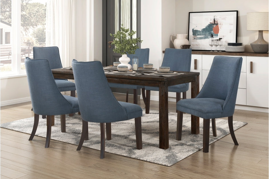 Subtle lines and hints of Arts and Crafts design create the classic look of the Paulson Collection. The transitional styling of the table allows for versatility of pairing within the decorative environment of your home. A dark brown finish is utilized to highlight the acacia veneer’s distinct grain. The paired chairs that complement the table’s design feature dark walnut-finished wood legs, tailored welting, contoured seat, and blue-gray textured fabric upholstery