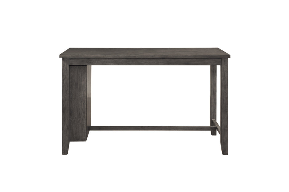 The multifunctional design of the Timbre Collection will be the perfect addition to your dining nook. A built-in bookcase provides open display space to this counter height offering. Wire brushed acacia veneer is highlighted by a gray finish. Textured black faux leather seats top the accompanying stools and feature nailhead accent for added decorative flair