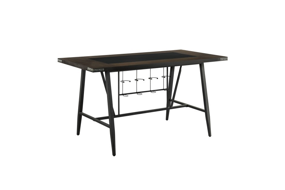 Perfectly styled for your casual dining room is the Appert Collection. This counter height offering features a dark gray metal base – with built in wine rack – that serves to support the wood top which frames a black rectangular glass insert. The round seats and back supports of the accompanying chairs are covered in faux leather