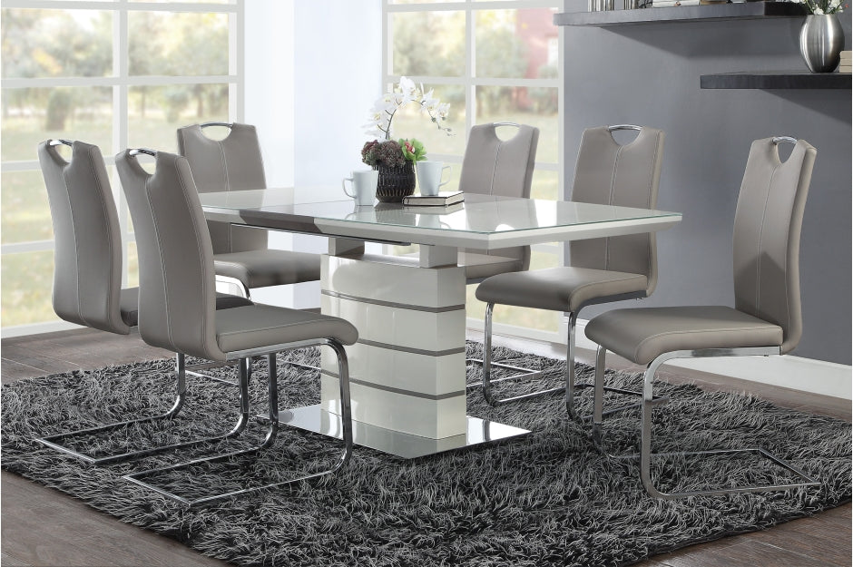 Sleek contemporary styling provides the platform which you will create your casual dining space in the Glissand Collection. Ultra-bright high gloss white and gray-taupe finish is paired on the table top and pedestal base, creating distinct contrast to the high polish chrome base plate. The continuous base of the accenting chairs rises to support gray-taupe faux leather seats with understated vertical stitching and chrome chair top accent providing additional visual interest. A smooth glide system opens with ease to reveal the self-storing butterfly leaf