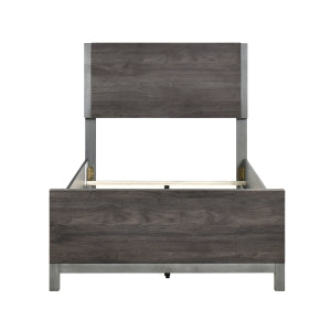 The sleek design of the Zephyr Collection pairs clean lines with modern convenience to create a style that will be the perfect palette for your design aspirations. The twin low-profile panel bed features painted metal-finish banding on the headboard’s sides and the footboard’s base rail, creating the perfect accenting contrast to the dark gray faux wood finish of the melamine veneer