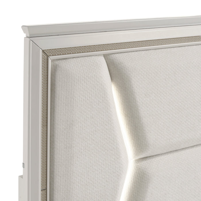Transform your bedroom into a luxurious retreat with this stunning white and gold panel bed. Crafted with a durable engineered wood frame, complemented by unique acrylic front legs and sturdy metal rear legs, this queen bed offers a perfect blend of style and stability. The chenille upholstered headboard, featuring built-in LED lighting, adds a touch of modern glamour while providing a comfortable backrest. The diagonal grain embossed panels on the headboard and footboard create a sophisticated texture, enhancing the overall visual appeal. This bed includes a headboard, footboard, and rails, providing a complete framework for your sleeping sanctuary. A foundation or box spring is required, ensuring optimal mattress support. Assembly is required